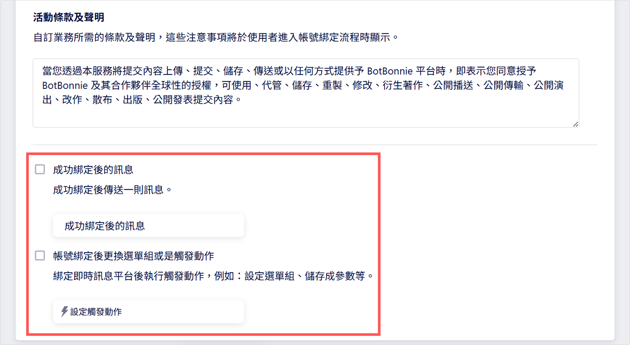 - 帳號綁定後更換選單組或是觸發動作:啟用這個選項後,綁定成功後便能觸發特定動作。