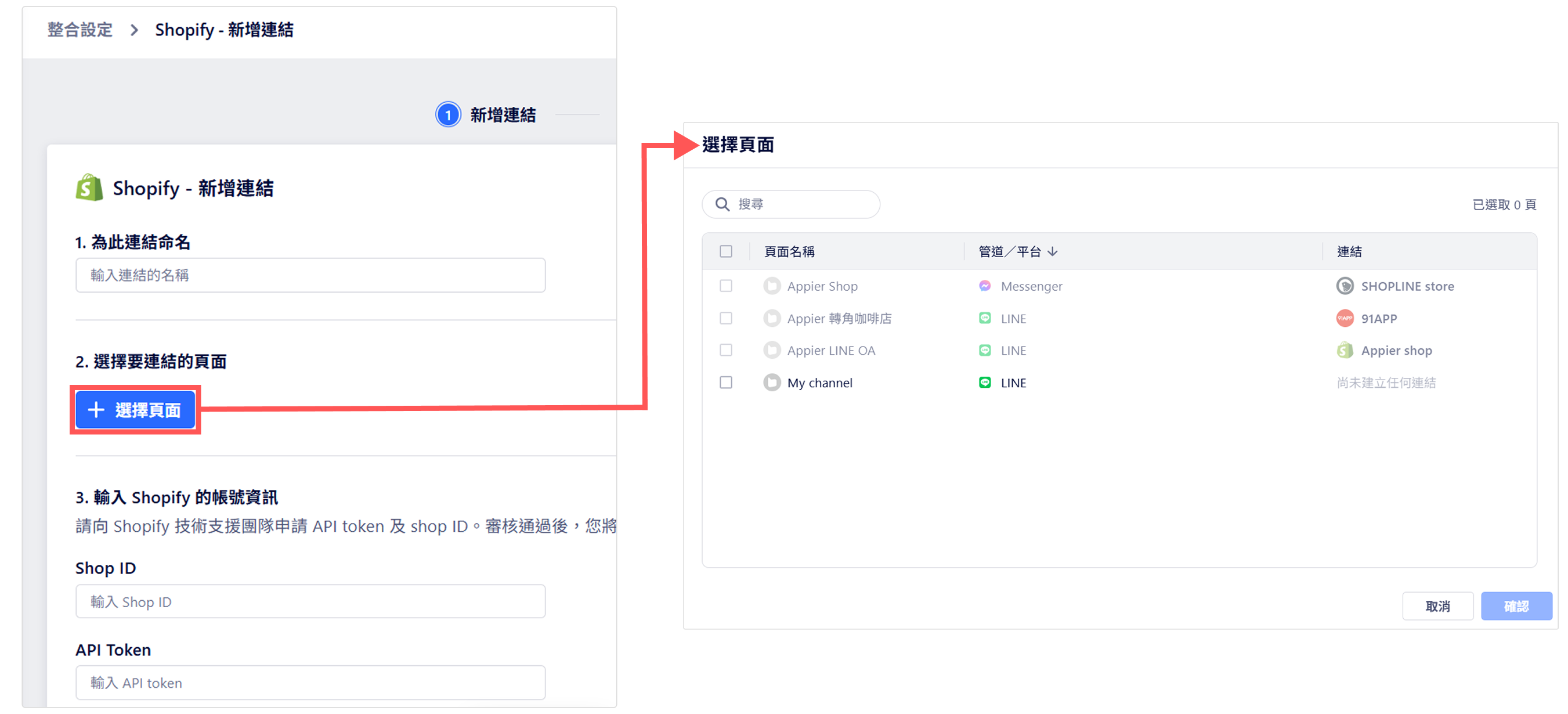 - 點擊 +選擇頁面以選擇想要連結的 Messenger 或 LINE 官方帳號。