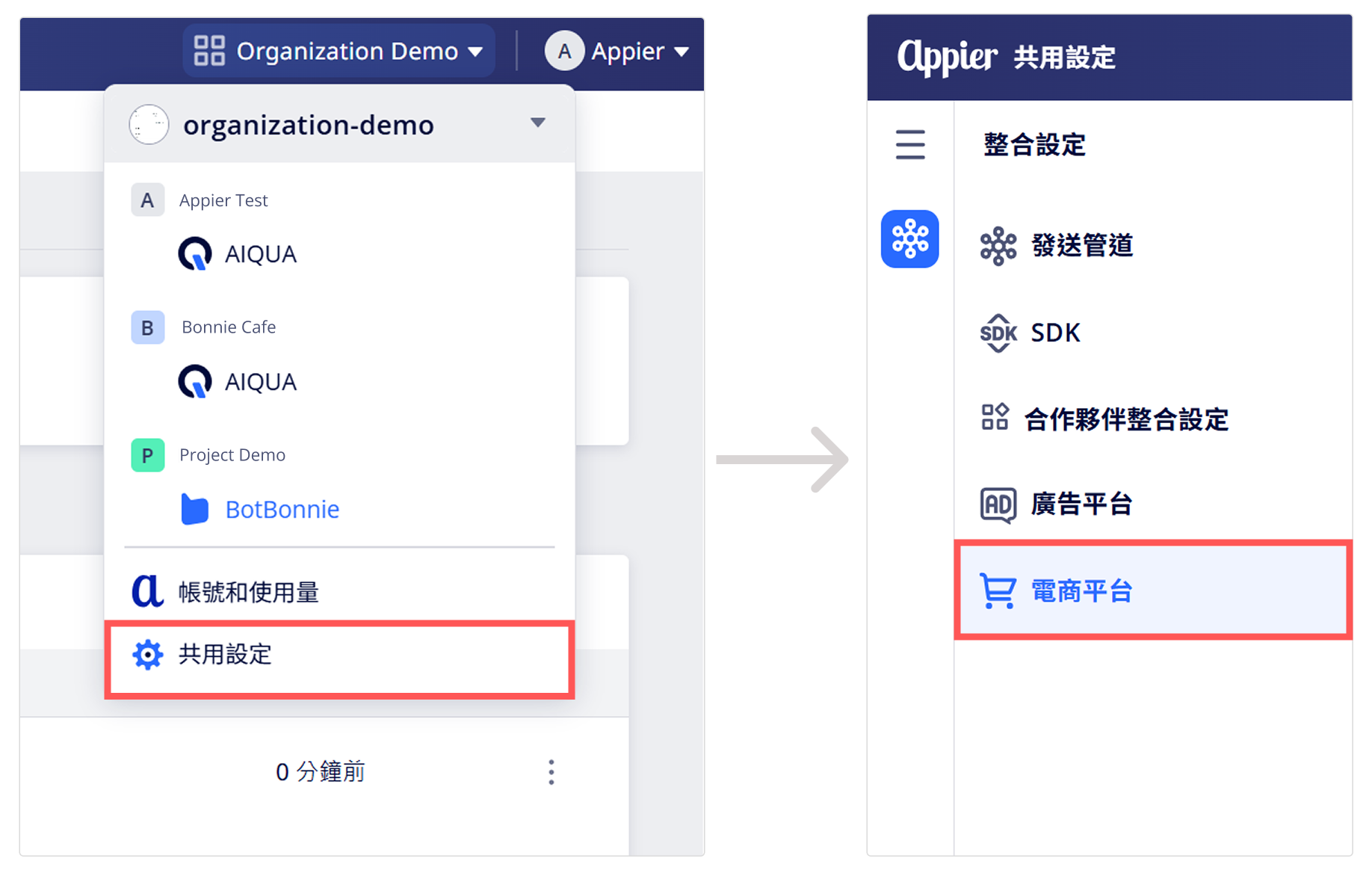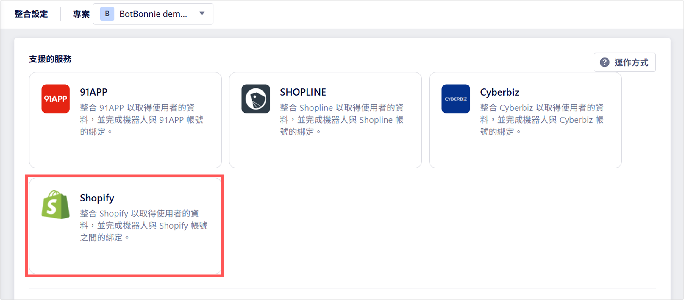 - 在 BotBonnie 控制台上,從頂部的專案下拉選單中選擇共用設定後,從左側選單點選電商平台。