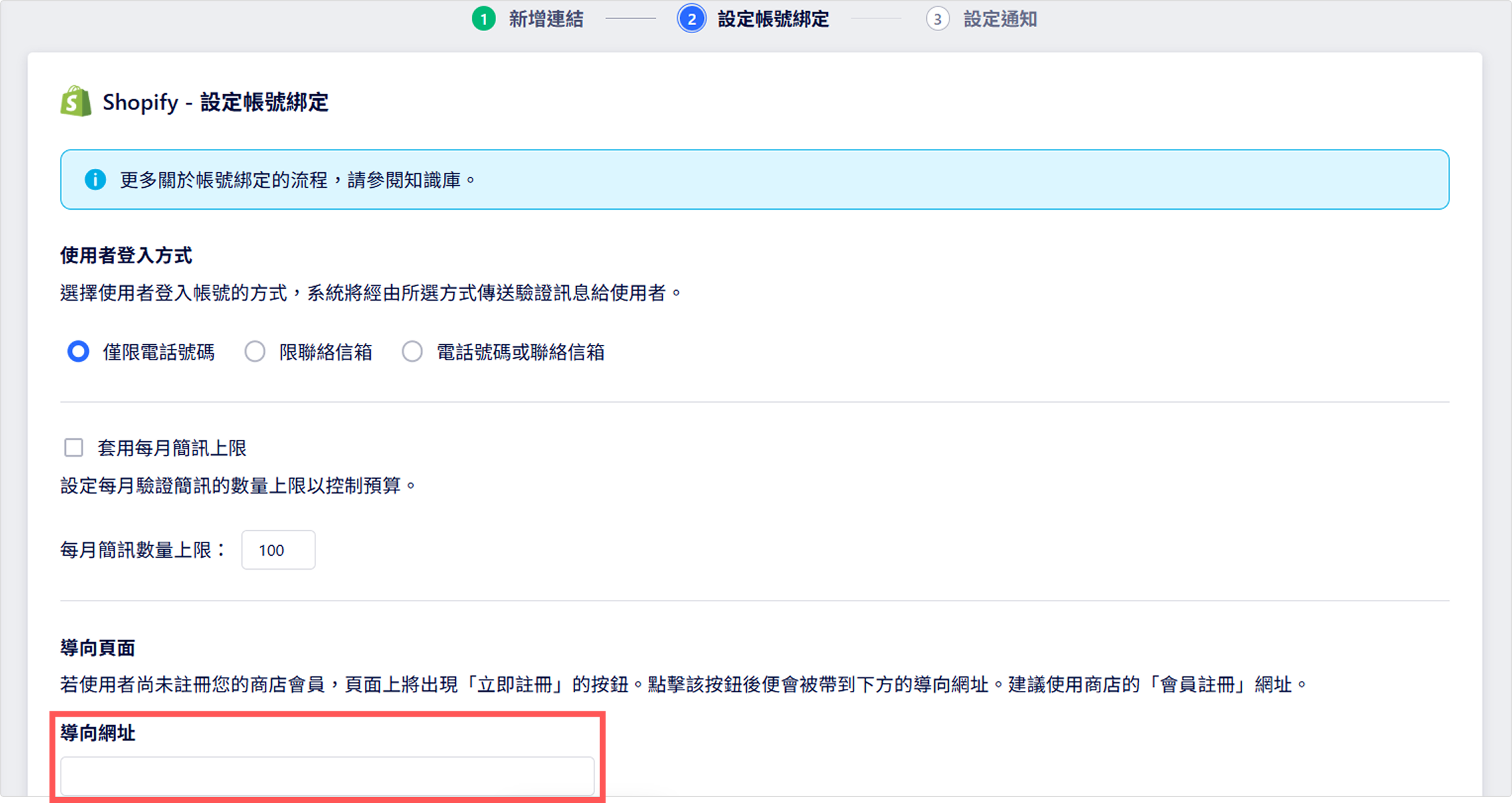 - 輸入導向網址,即使用者註冊或登入帳號以完成帳號綁定的網頁。