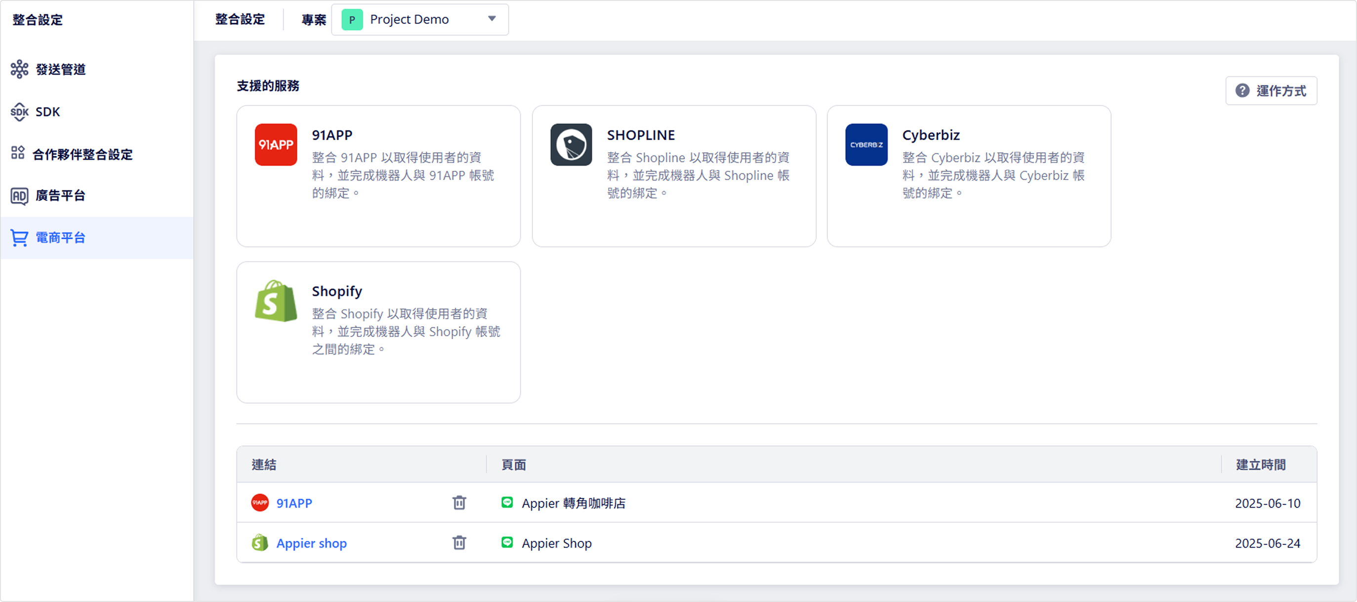完成初始設定後,您隨時可以管理您的電商平台的連接設定。