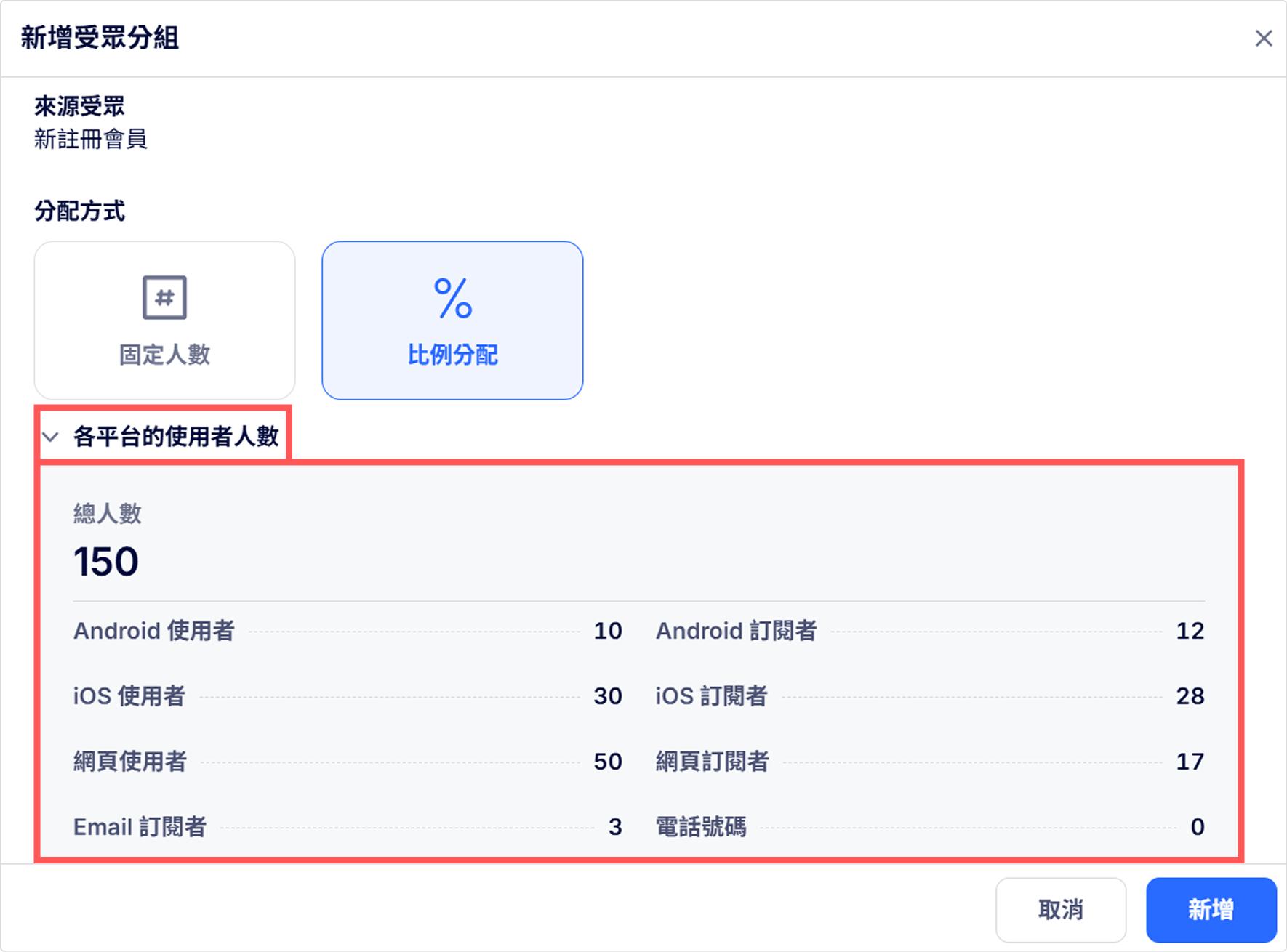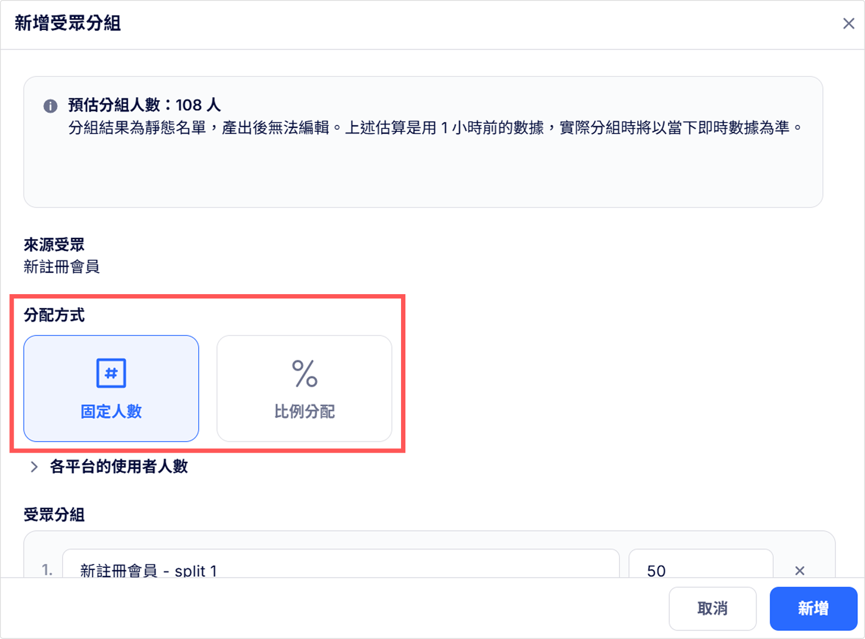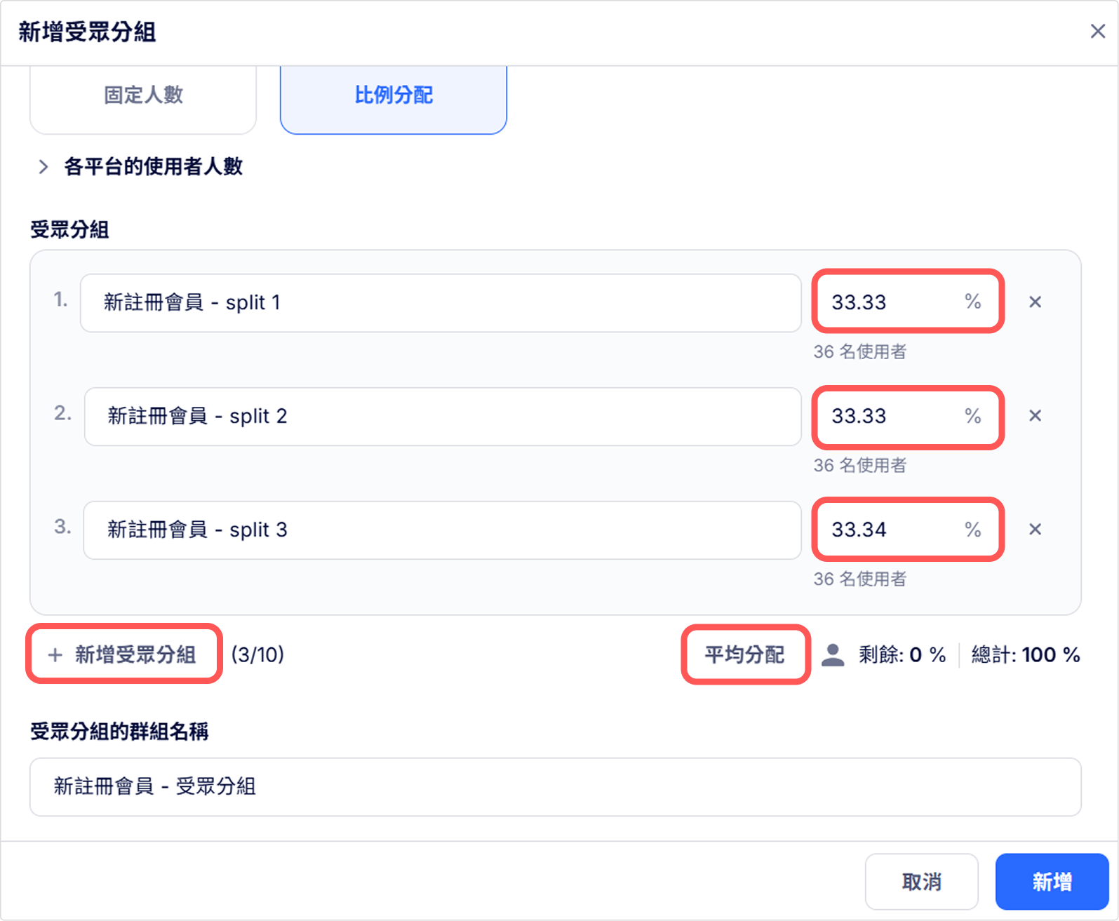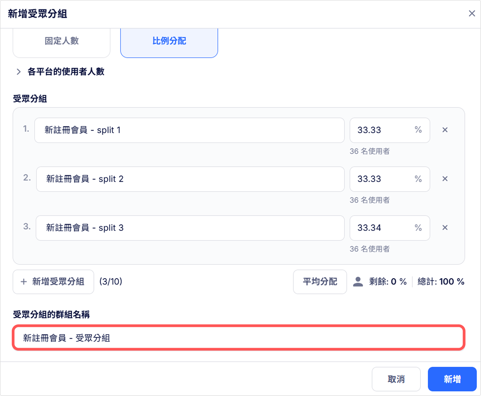 - 比例分配:輸入要從來源受眾中將多少比例的使用者分配到各個組別中。