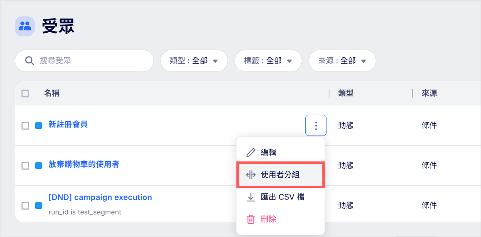 在受眾清單上,找到您想要分組的受眾後,點擊