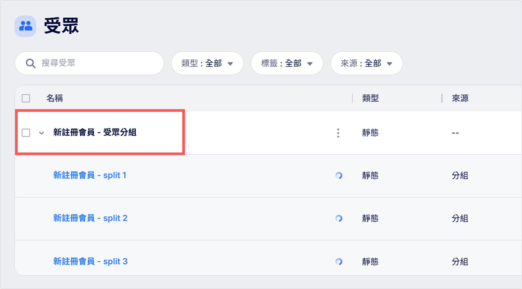建立完成後,受眾清單上將出現一個包含所有組別的新群組。