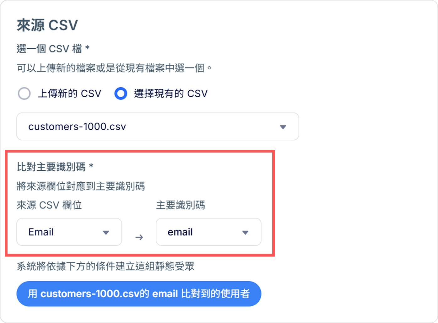 在比對主要識別碼下方,用包含主要使用者識別碼的 CSV 欄位比對專案現有資料庫中的相應屬性。