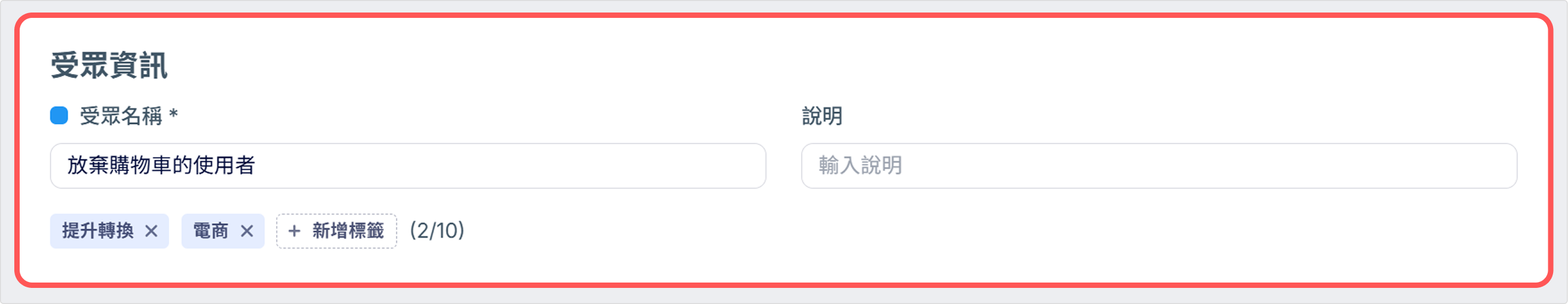 在受眾資訊下方,輸入名稱、說明(可省略)和標籤(可省略)。