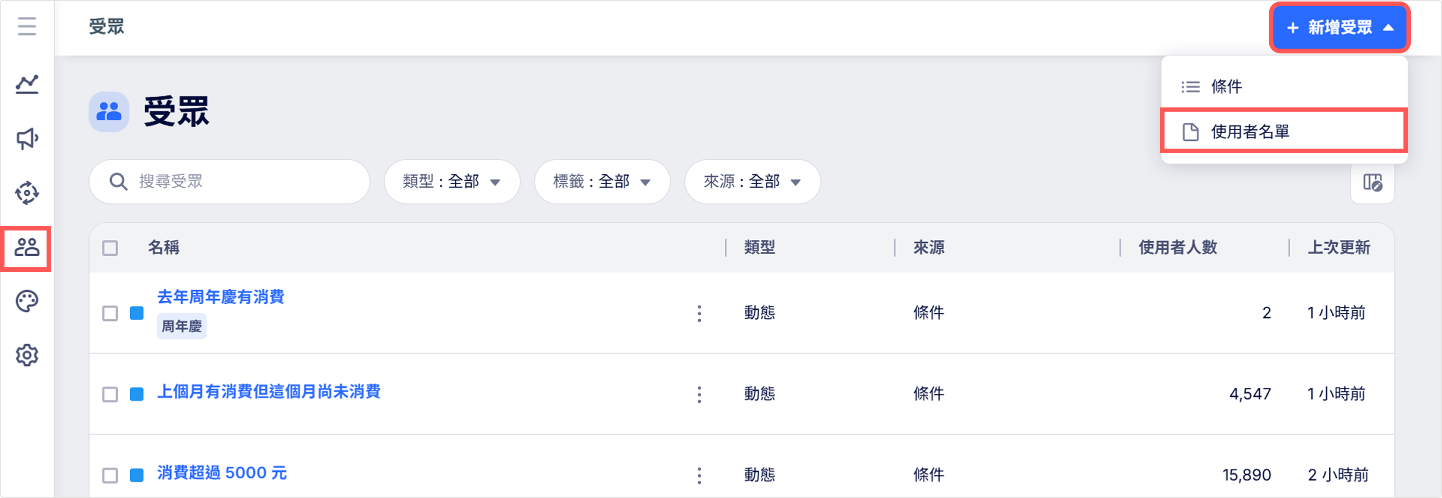 如需用上傳的 CSV 檔案來比對使用者識別碼,前往受眾後,點擊 +新增受眾>使用者名單。