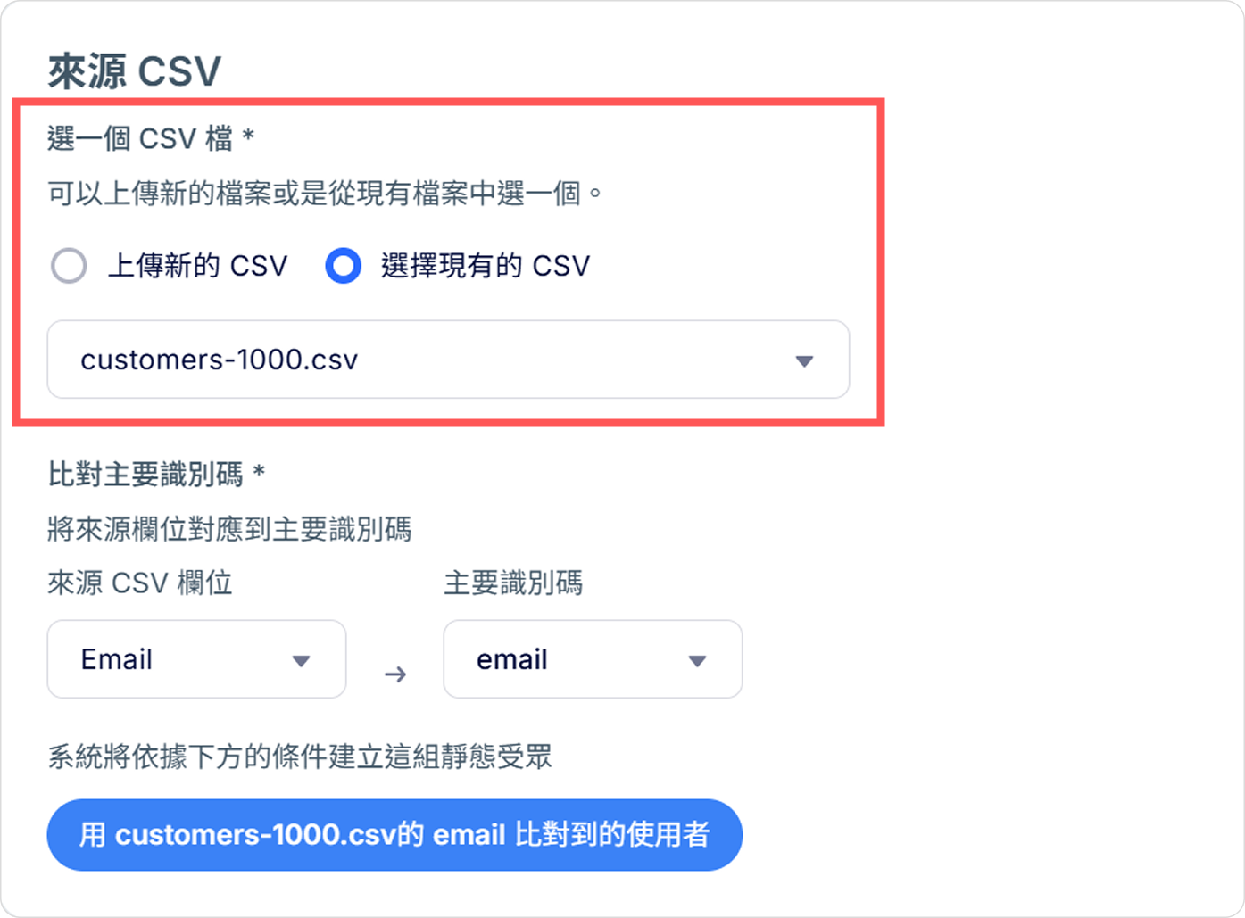 在來源 CSV 下方,選擇要上傳新的使用者檔案或選取現有的檔案。CSV 檔案大小上限為 50 MB。
