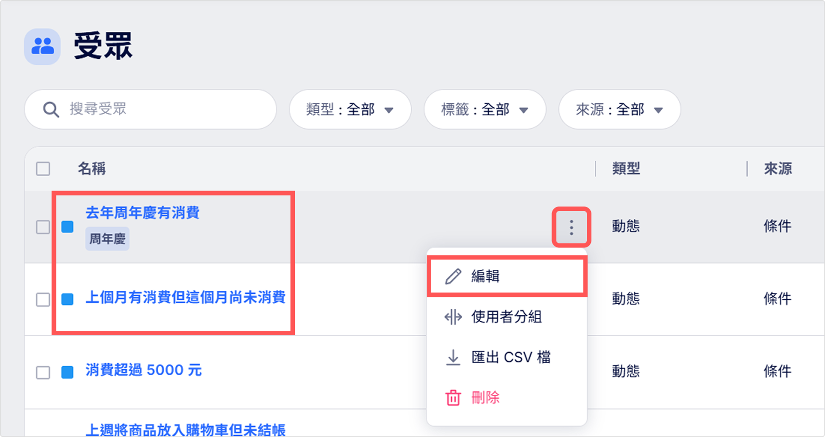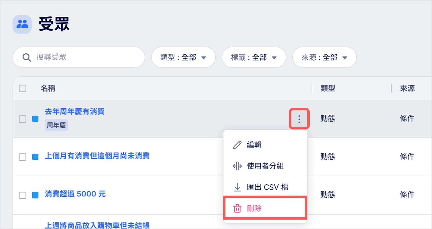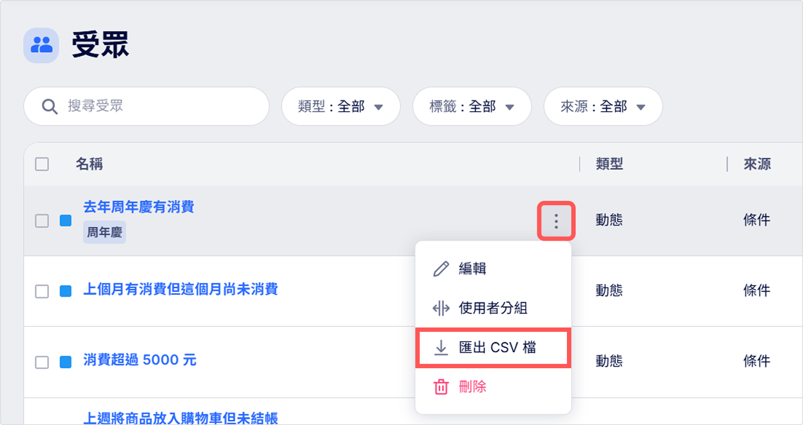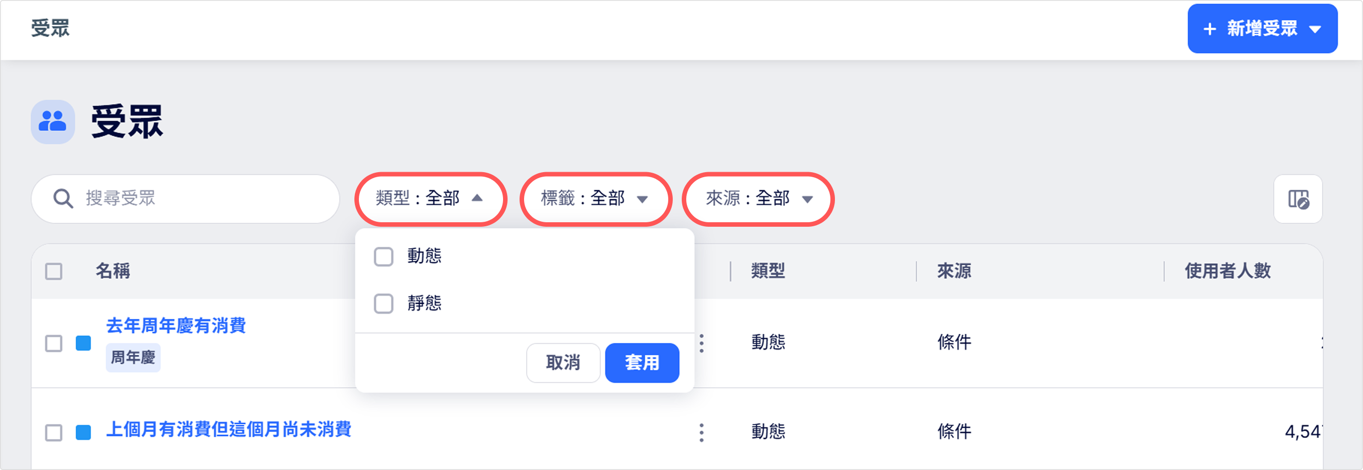 透過篩選用的下拉選單,用類型、標籤或來源進一步篩選受眾清單上顯示的結果。