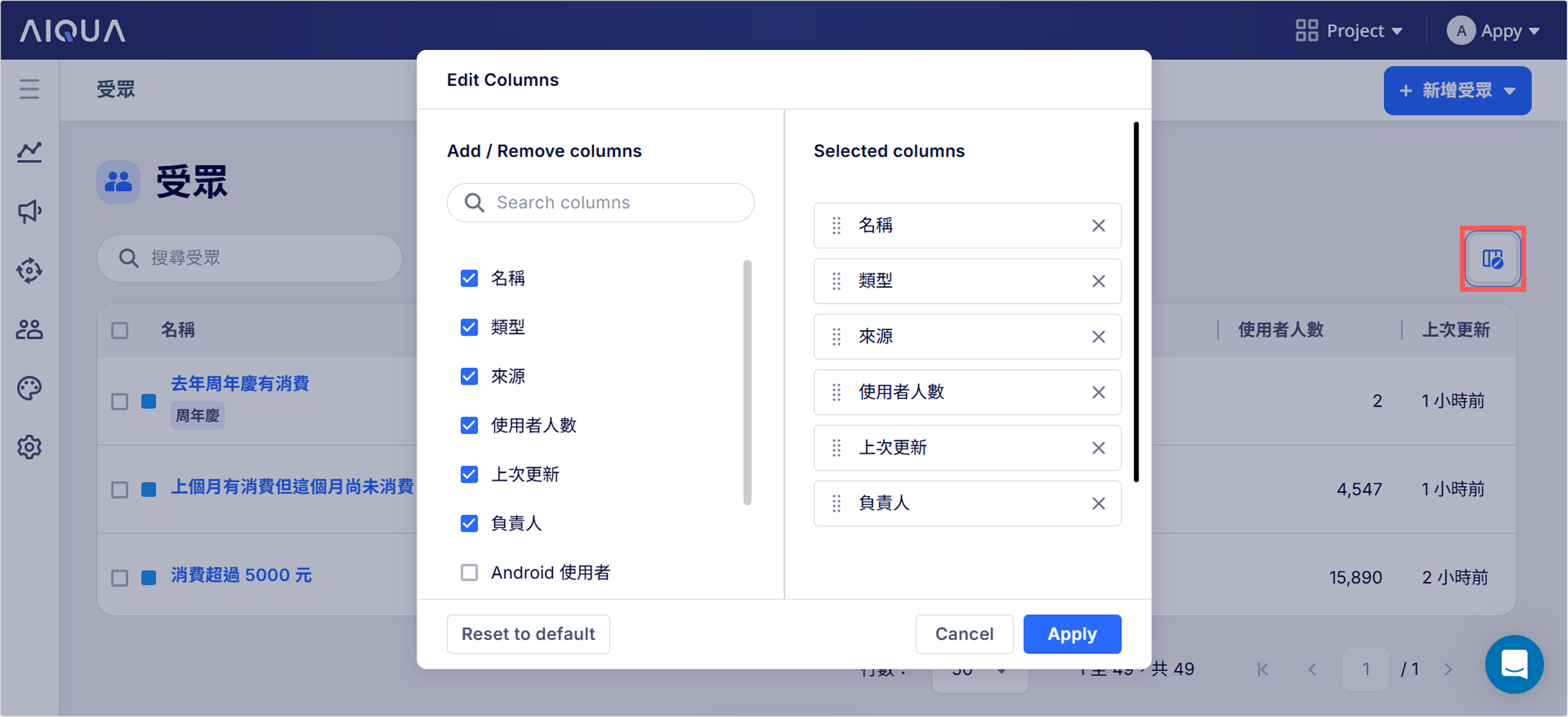 - 自訂受眾清單上的欄位以確保受眾清單上只顯示最相關的資訊。