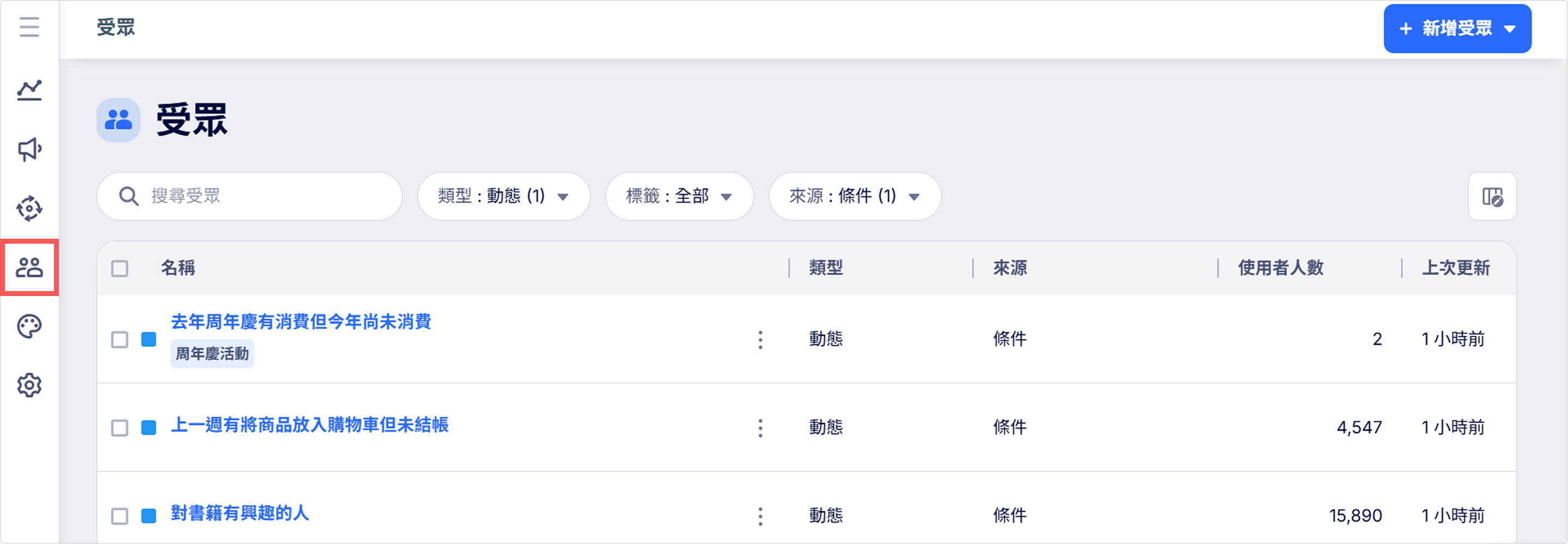 受眾頁面上會提供專案中所有的受眾。您可以在這個頁面上查看受眾詳情並管理您的受眾。