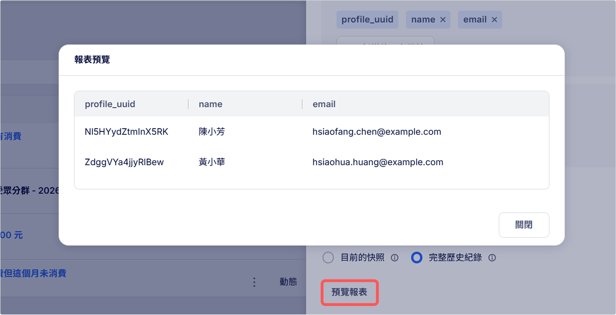 - 預覽報表後,點擊匯出即可產生報表。報表準備就緒後,您將收到一封包含下載連結的 Email。