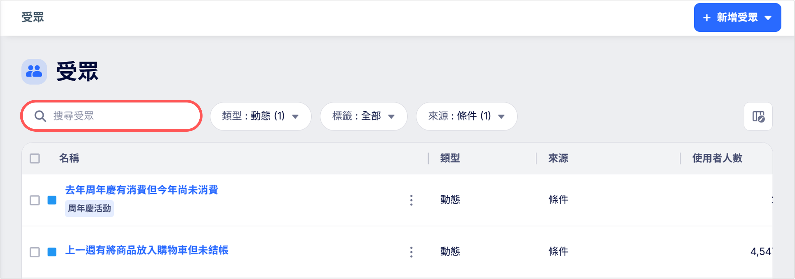 在搜尋欄中輸入關鍵字,用名稱搜尋受眾。