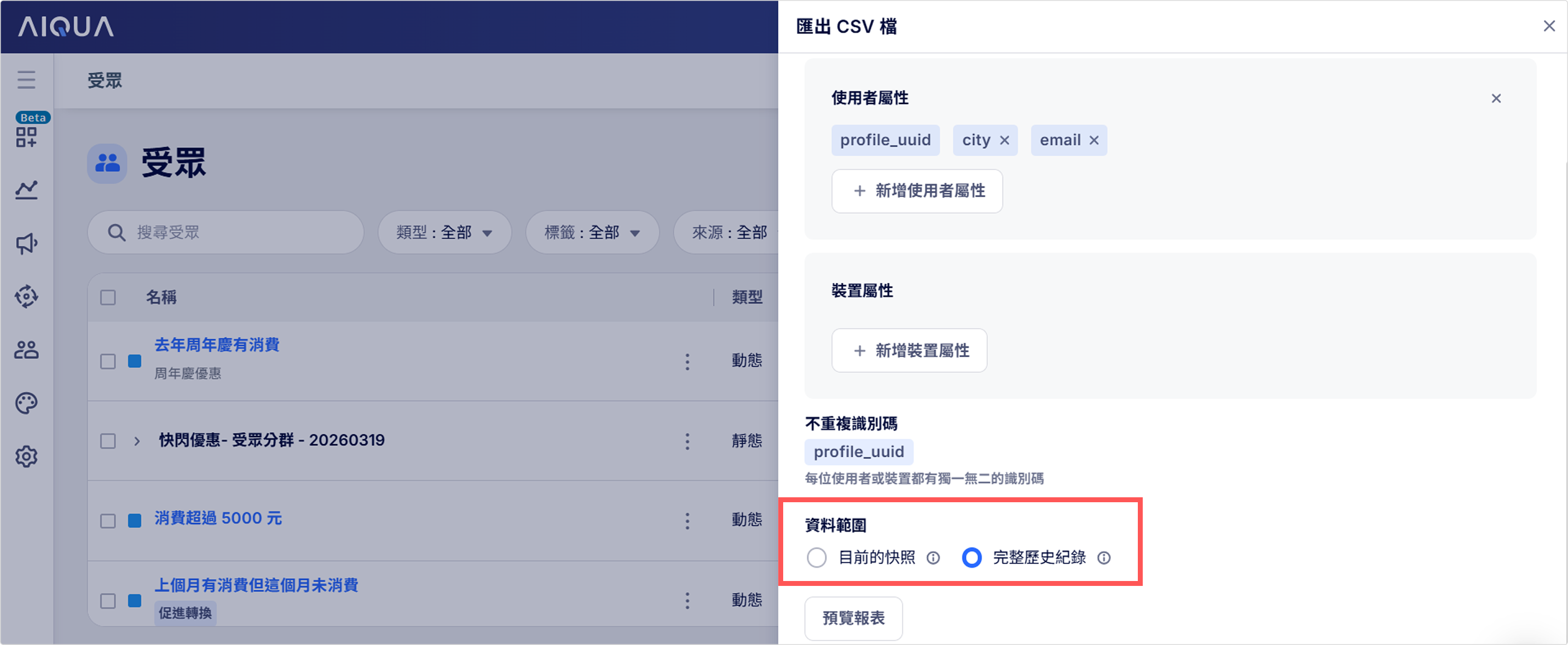 | 完整歷史紀錄 | 匯出所有歷史使用者屬性值。 |