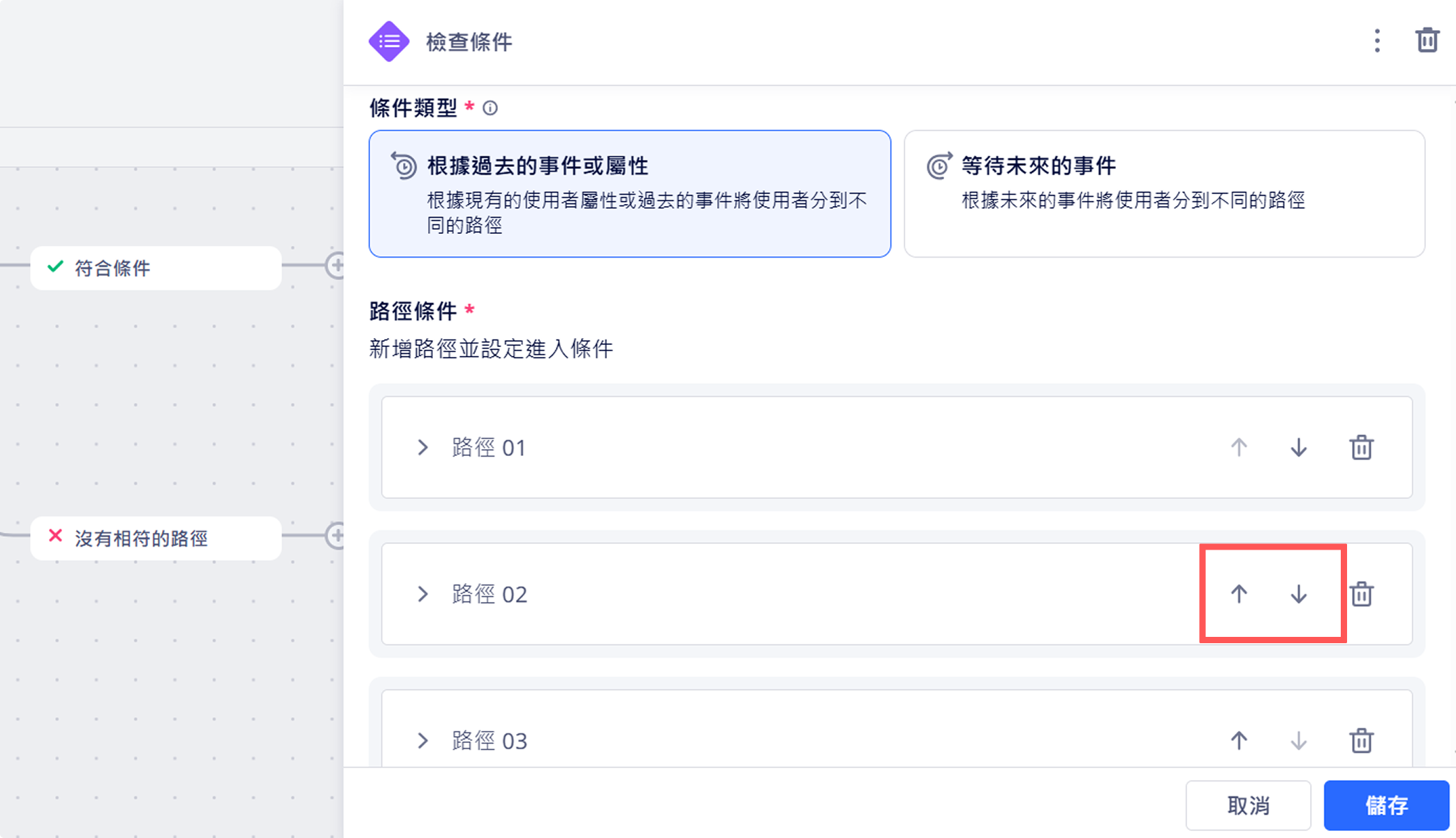 - 新增不同的路徑來將使用者分流。如果使用者符合多條路徑的條件,他們將進入優先順序最高的路徑。路徑的優先順序以降冪排序,亦即路徑 01 的優先順序高於路徑 02。用箭頭調整路徑的優先順序。